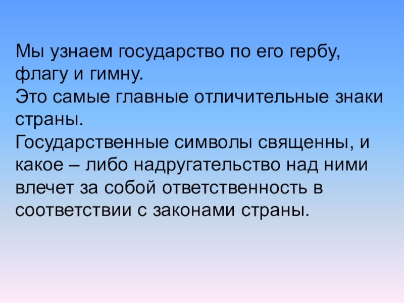 Государственные символы священны, и какое – либо надругательство над ними влечет за собой ответственность в соответствии с законами страны.