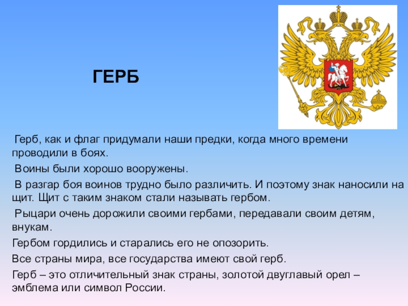 Герб – это отличительный знак страны, золотой двуглавый орел – эмблема или символ России.