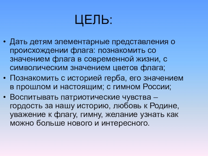 Воспитывать патриотические чувства – гордость за нашу историю, любовь к Родине, уважение к флагу, гимну, желание узнать как можно больше нового и интересного.