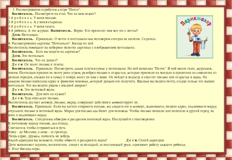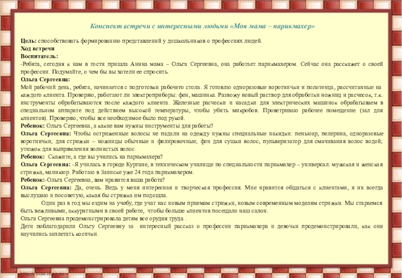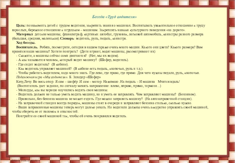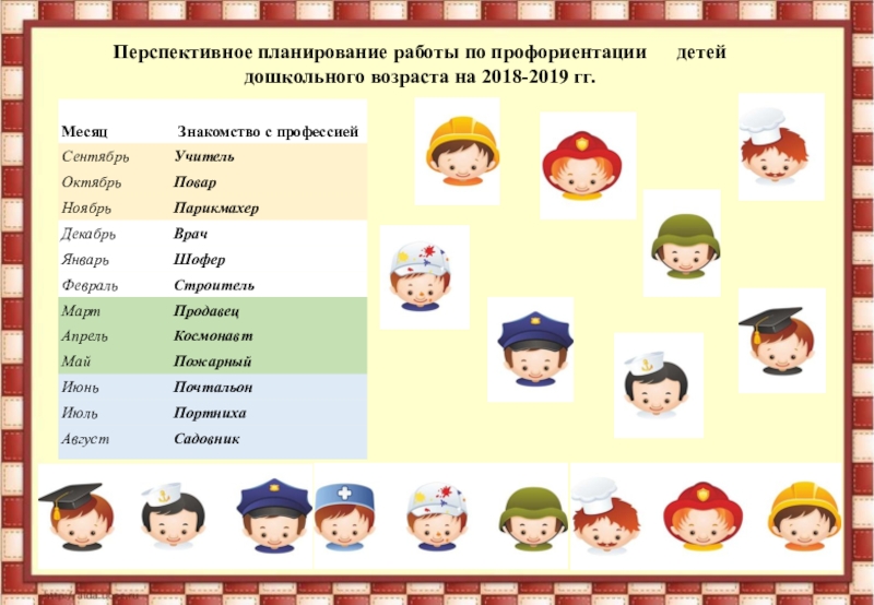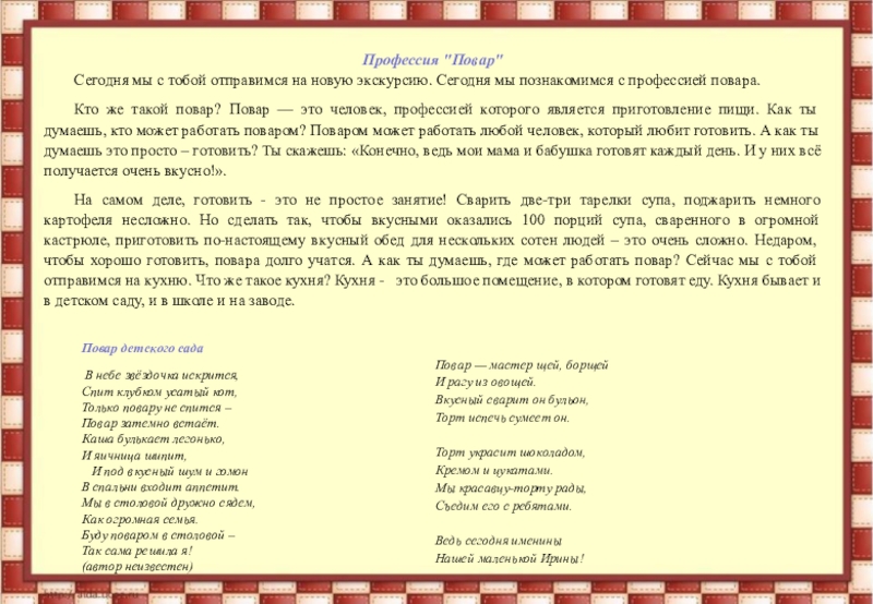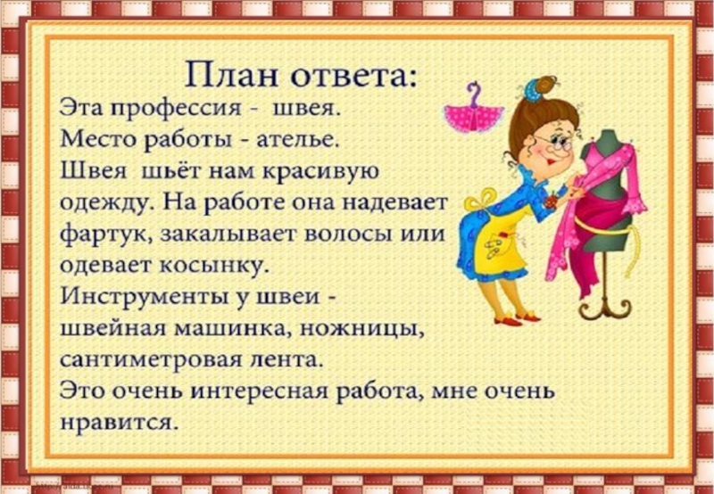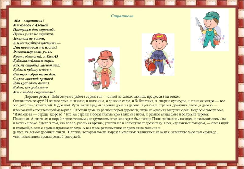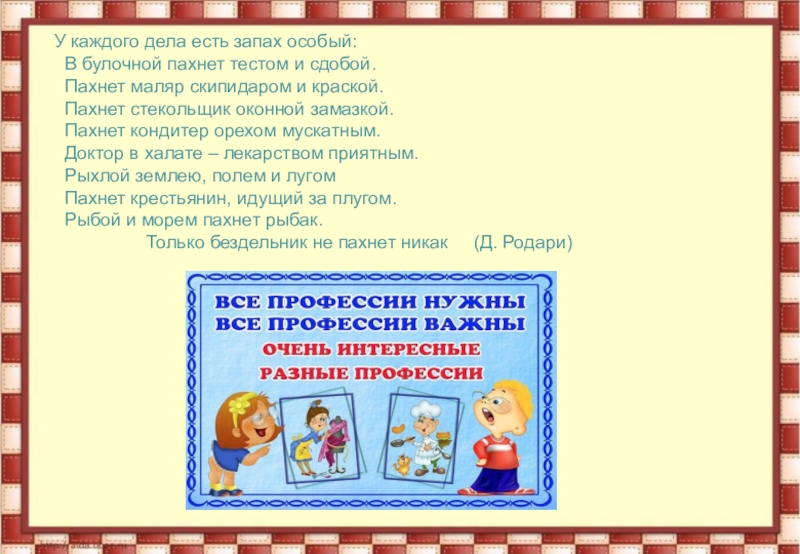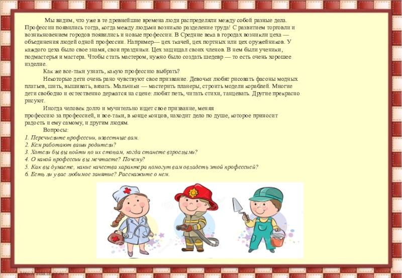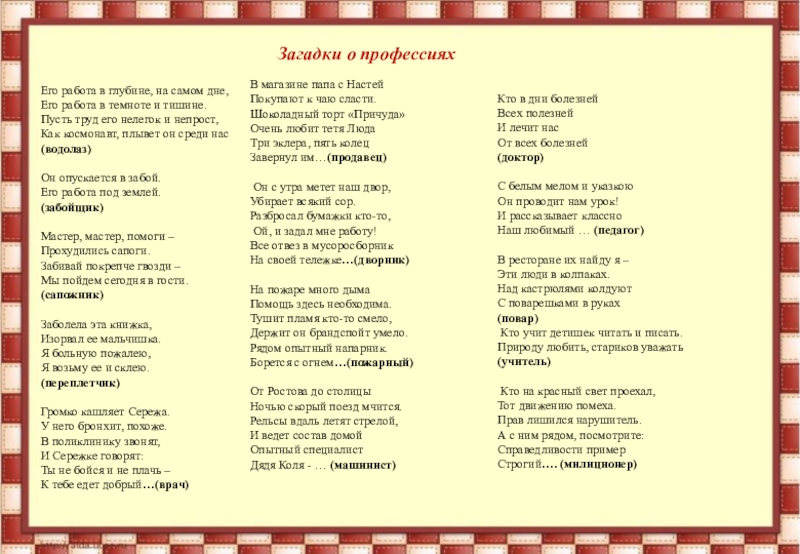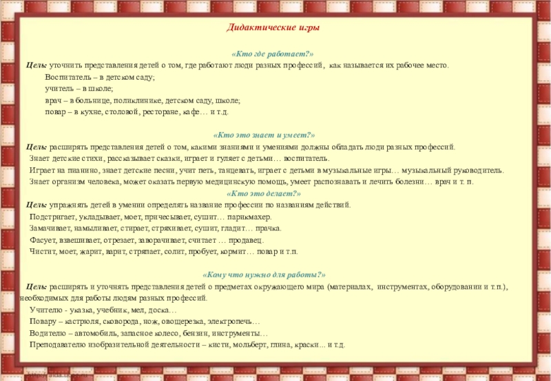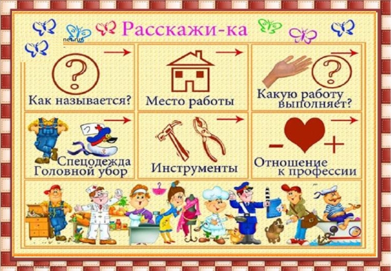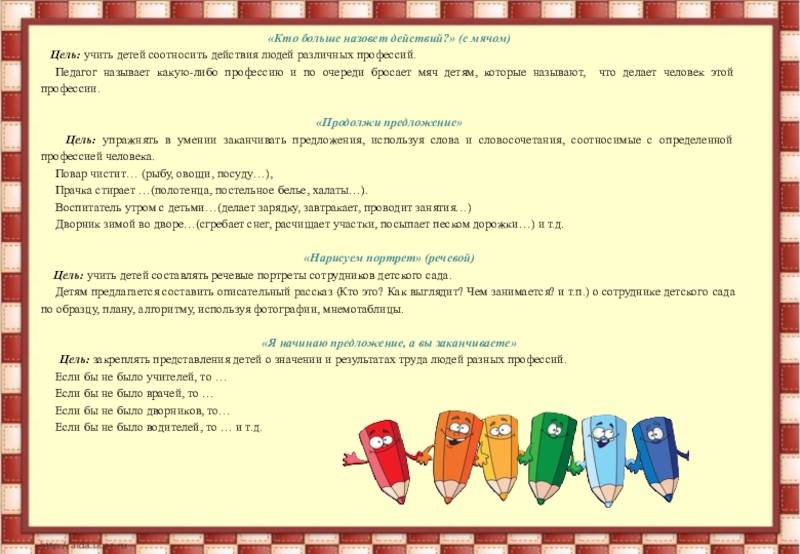 Цель: упражнять детей в умении определять название профессии по названиям действий.