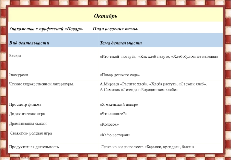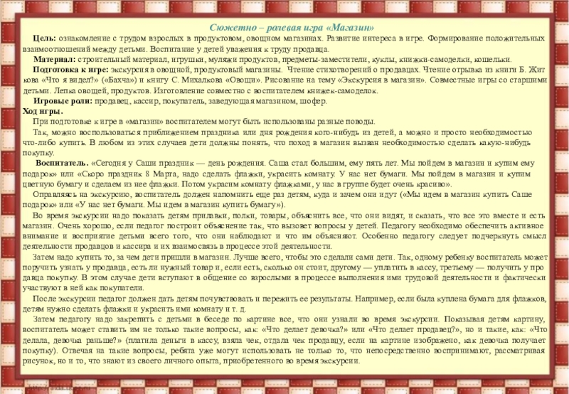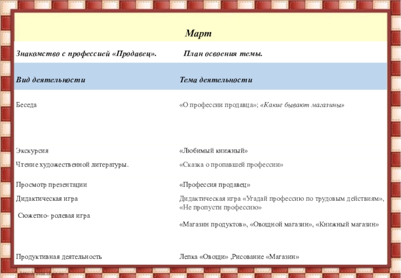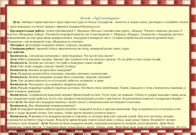 Цель: закреплять представления детей о значении и результатах труда людей разных профессий.