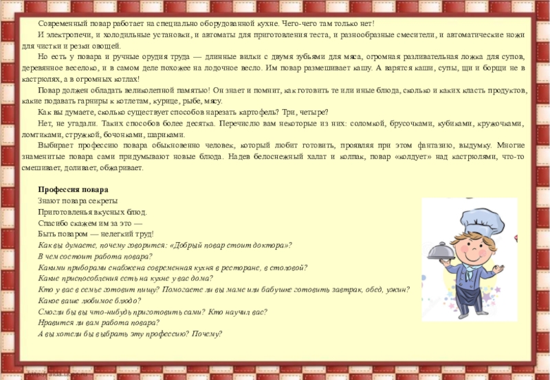 Повару – кастрюля, сковорода, нож, овощерезка, электропечь…