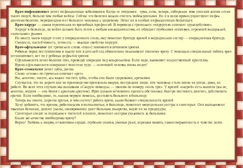 Знает организм человека, может оказать первую медицинскую помощь, умеет распознавать и лечить болезни… врач и т. п.