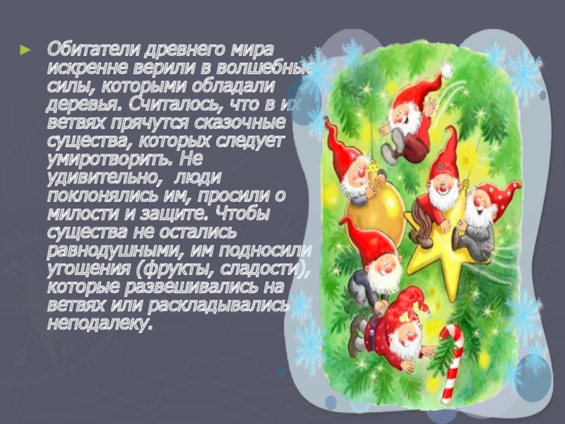 Считалось, что в их ветвях прячутся сказочные существа, которых следует умиротворить. Не удивительно, люди поклонялись им, просили о милости и защите. Чтобы существа не остались равнодушными, им подносили угощения (фрукты, сладости), которые развешивались на ветвях или раскладывались неподалеку.