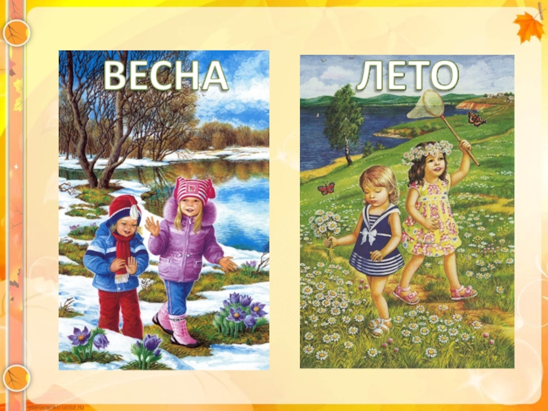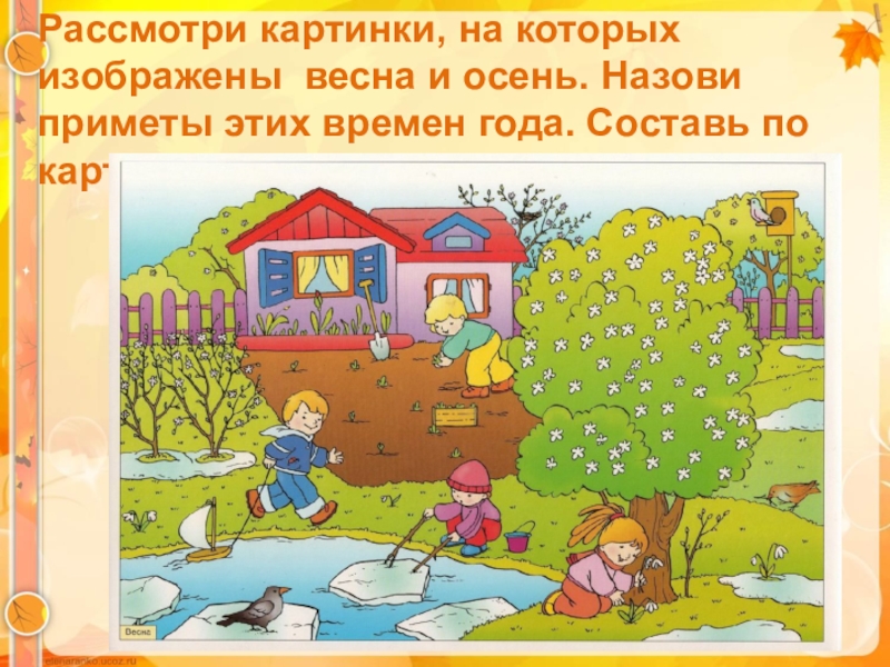 Рассмотри картинки, на которых изображены весна и осень. Назови приметы этих времен года. Составь по картинкам сравнительный