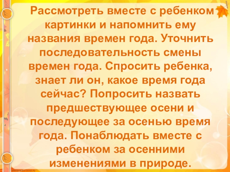года. Уточнить последовательность смены времен года. Спросить ребенка, знает ли он, какое время года сейчас? Попросить назвать предшествующее осени и последующее за осенью время года. Понаблюдать вместе с ребенком за осенними изменениями в природе.