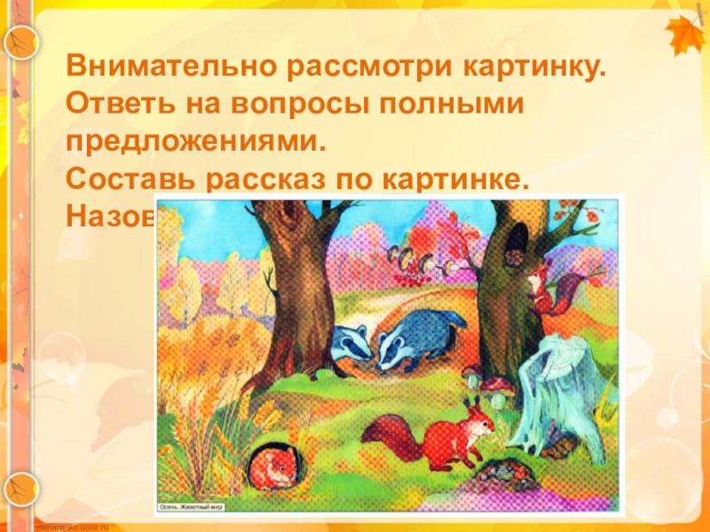 Внимательно рассмотри картинку. Ответь на вопросы полными предложениями. Составь рассказ по картинке. Назови свой рассказ.