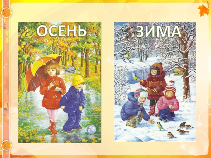 Слайд 6Рассмотри картинки, на которых изображены весна и осень. Назови приметы этих