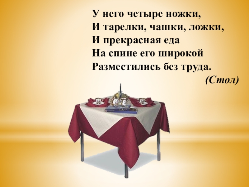 У него четыре ножки,И тарелки, чашки, ложки,И прекрасная едаНа спине его широкойРазместились без труда.