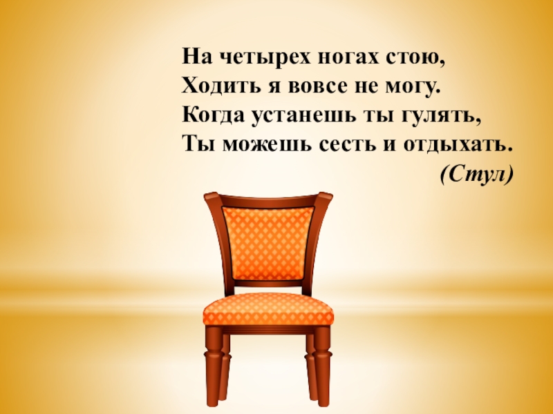 На четырех ногах стою,Ходить я вовсе не могу.Когда устанешь ты гулять,Ты можешь сесть и отдыхать.