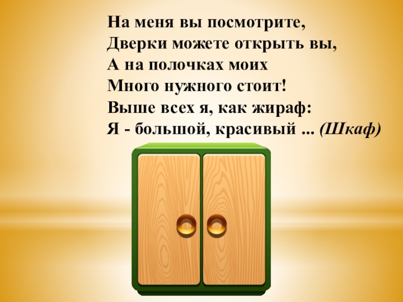 На меня вы посмотрите,Дверки можете открыть вы,А на полочках моихМного нужного стоит!Выше всех я, как жираф:Я -