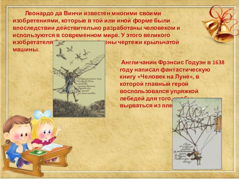 Англичанин Фрэнсис Годуэн в 1638 году написал фантастическую книгу «Человек на Луне», в которой главный герой воспользовался упряжкой лебедей для того, чтобы вырваться из плена.