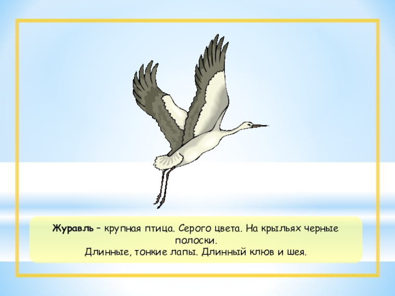 Журавль – крупная птица. Серого цвета. На крыльях черные полоски.Длинные, тонкие лапы. Длинный клюв и шея.