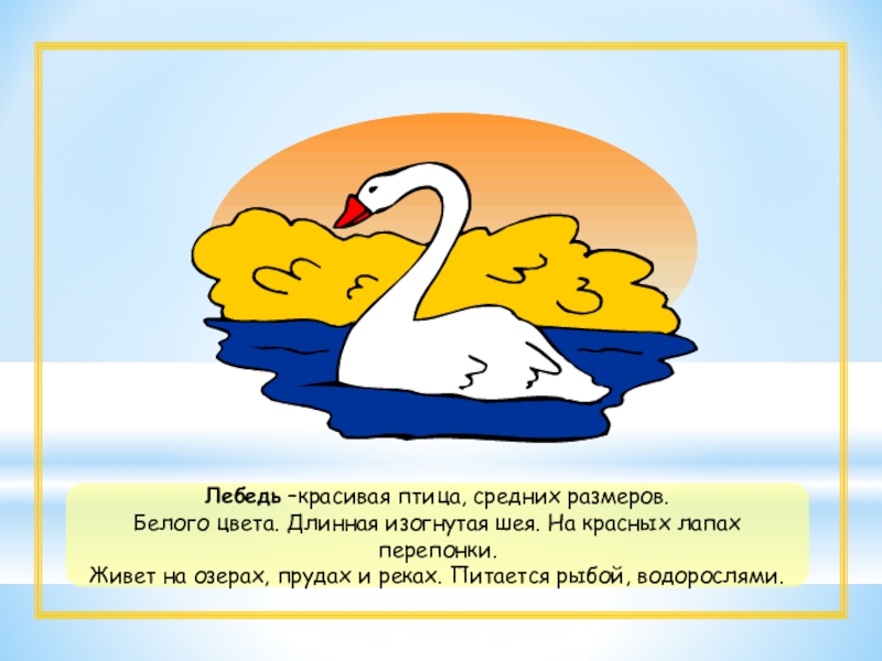Лебедь –красивая птица, средних размеров.Белого цвета. Длинная изогнутая шея. На красных лапах перепонки. Живет на озерах, прудах