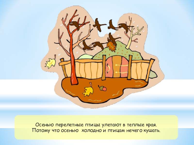 Осенью перелетные птицы улетают в теплые края. Потому что осенью холодно и птицам нечего кушать.