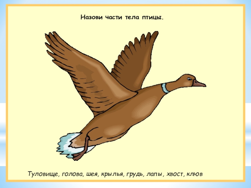 Назови части тела птицы.Туловище, голова, шея, крылья, грудь, лапы, хвост, клюв