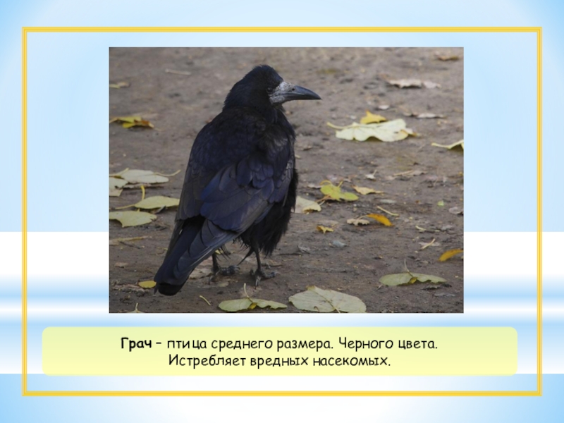 Грач – птица среднего размера. Черного цвета. Истребляет вредных насекомых.