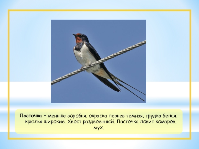 Ласточка – меньше воробья, окраска перьев темная, грудка белая,  крылья широкие. Хвост раздвоенный. Ласточка ловит комаров,