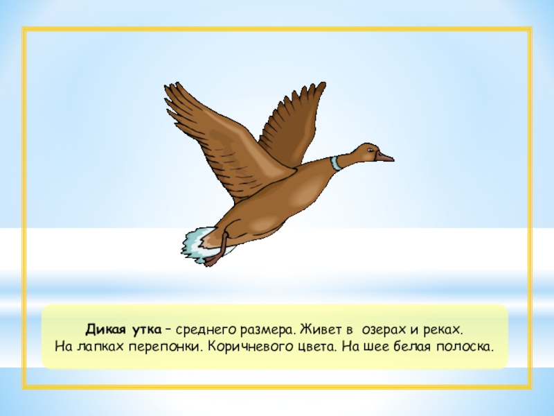 Дикая утка – среднего размера. Живет в озерах и реках. На лапках перепонки. Коричневого цвета. На шее