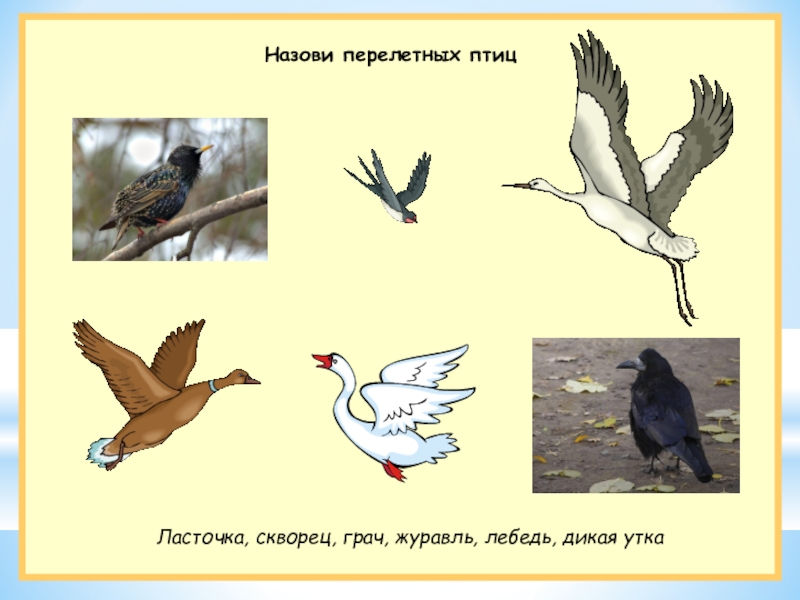 Назови перелетных птицЛасточка, скворец, грач, журавль, лебедь, дикая утка