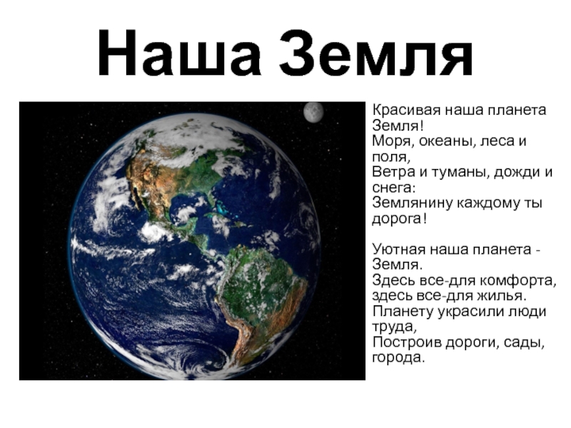 Наша ЗемляКрасивая наша планета Земля! Моря, океаны, леса и поля, Ветра и туманы, дожди и снега: Землянину
