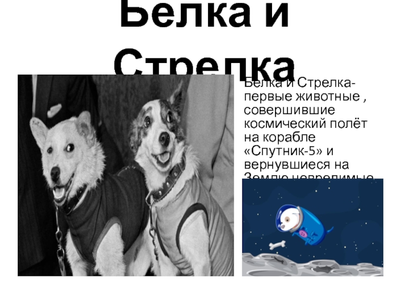 Белка и СтрелкаБелка и Стрелка-первые животные , совершившие космический полёт на корабле «Спутник-5» и вернувшиеся на Землю