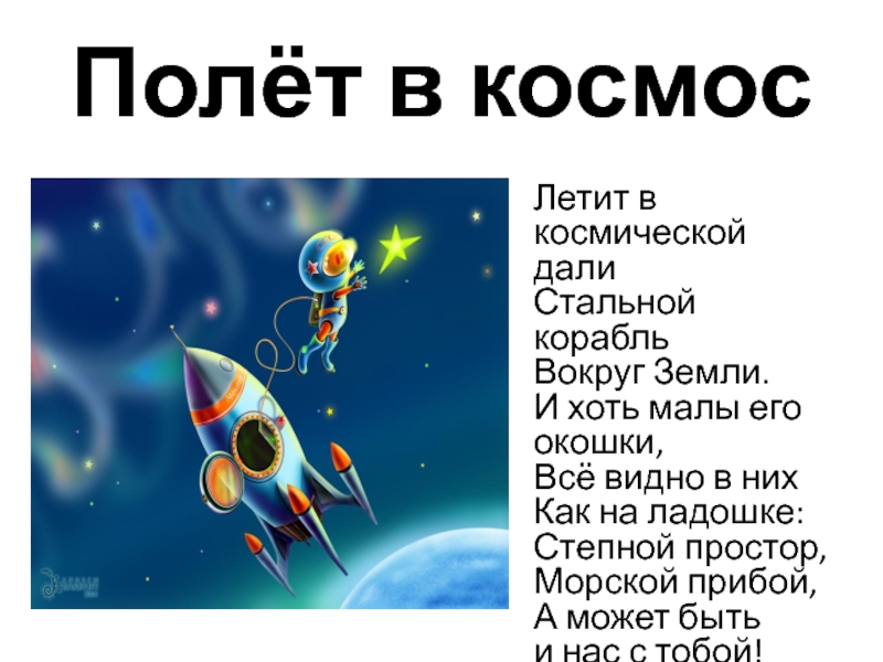 Полёт в космосЛетит в космической дали Стальной корабль Вокруг Земли. И хоть малы его окошки, Всё видно