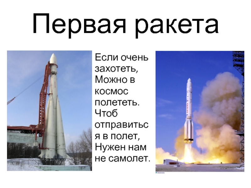 Первая ракетаЕсли очень захотеть, Можно в космос полететь. Чтоб отправиться в полет, Нужен нам не самолет.