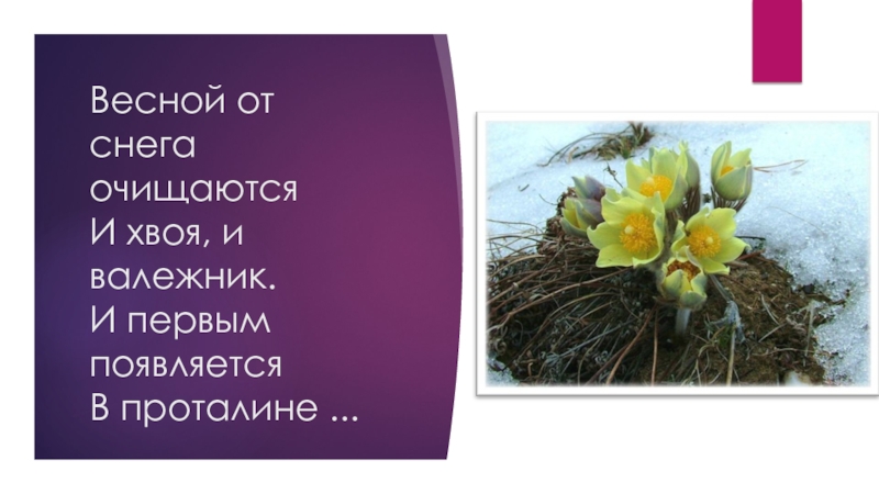 Слайд 6Весной от снега очищаются И хвоя, и валежник. И первым появляется В проталине ...