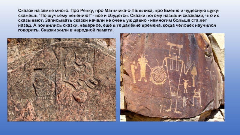 чудесную щуку: скажешь "По щучьему велению!" - все и сбудется. Сказки потому назвали сказками, что их сказывают; Записывать сказки начали не очень уж давно - немногим больше ста лет назад. А появились сказки, наверное, ещё в те далёкие времена, когда человек научился говорить. Сказки жили в народной памяти.