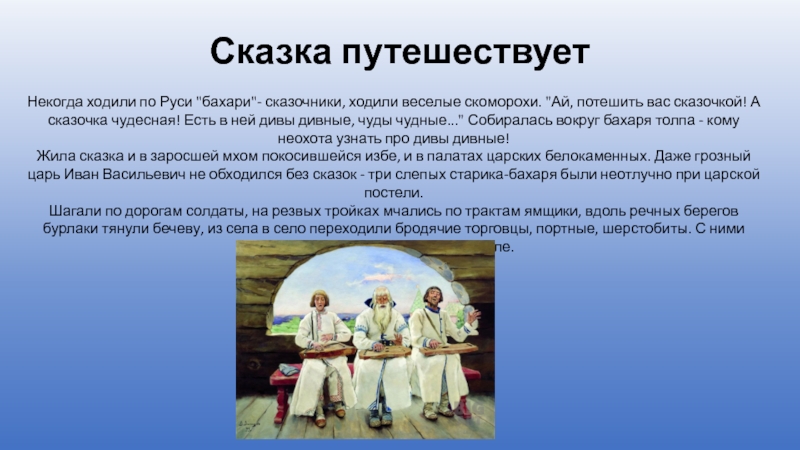 Некогда ходили по Руси "бахари"- сказочники, ходили веселые скоморохи. "Ай,