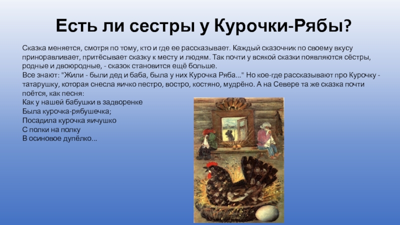 Слайд 5Есть ли сестры у Курочки-Рябы?