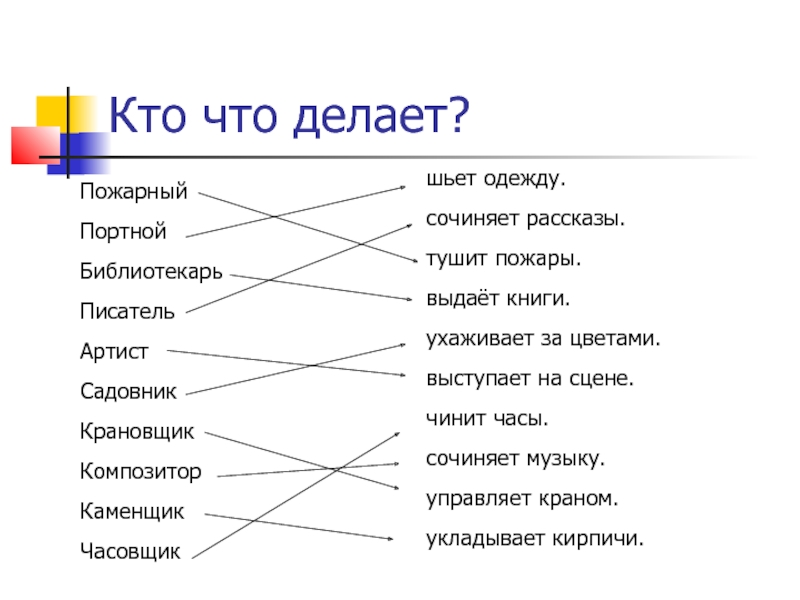 Кто что делает?ПожарныйПортнойБиблиотекарьПисательАртистСадовникКрановщикКомпозиторКаменщик Часовщикшьет одежду.сочиняет рассказы.тушит пожары.выдаёт книги.ухаживает за цветами.выступает на сцене.чинит часы.сочиняет музыку.управляет краном.укладывает кирпичи.