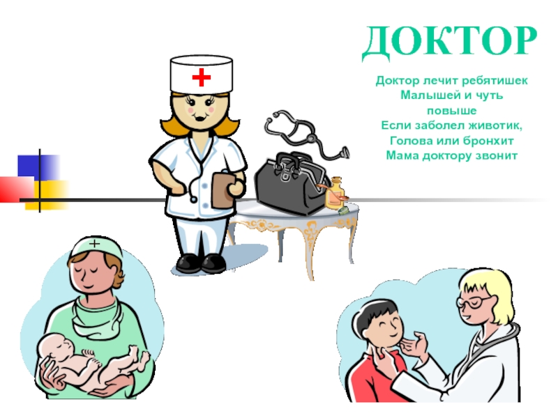 ДОКТОРДоктор лечит ребятишекМалышей и чуть повышеЕсли заболел животик,Голова или бронхитМама доктору звонит