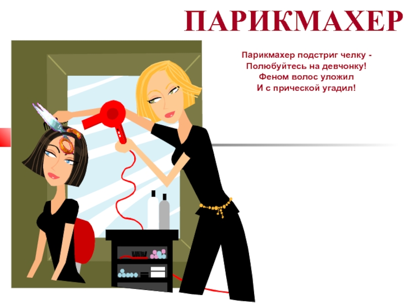 ПАРИКМАХЕРПарикмахер подстриг челку - Полюбуйтесь на девчонку!Феном волос уложилИ с прической угадил!