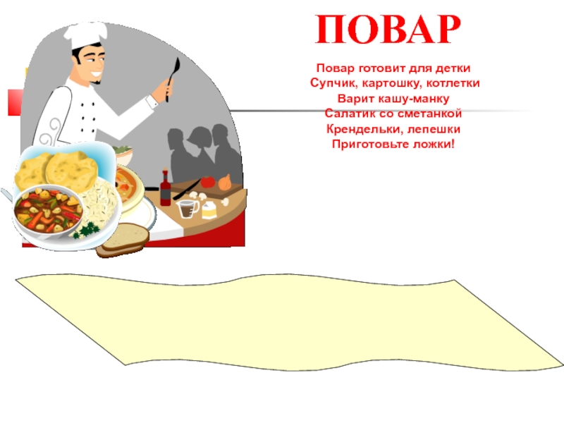 ПОВАРПовар готовит для деткиСупчик, картошку, котлеткиВарит кашу-манкуСалатик со сметанкойКрендельки, лепешкиПриготовьте ложки!