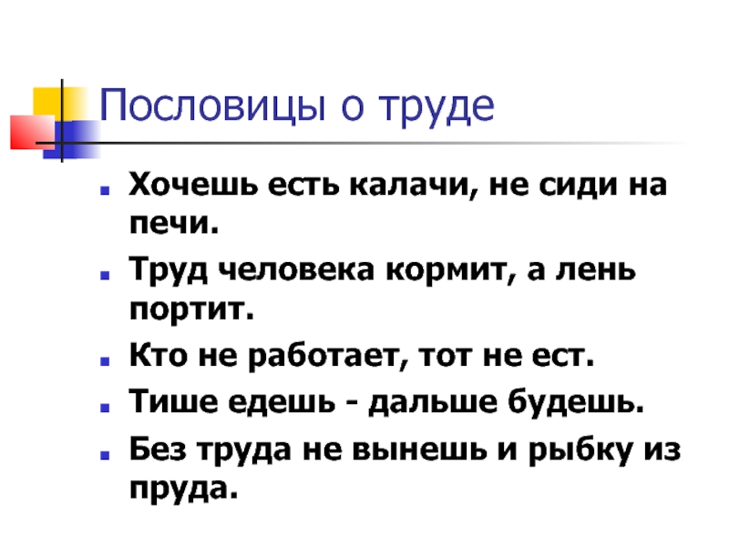Пословицы о трудеХочешь есть калачи, не сиди на печи.Труд человека кормит, а лень портит.Кто не работает, тот