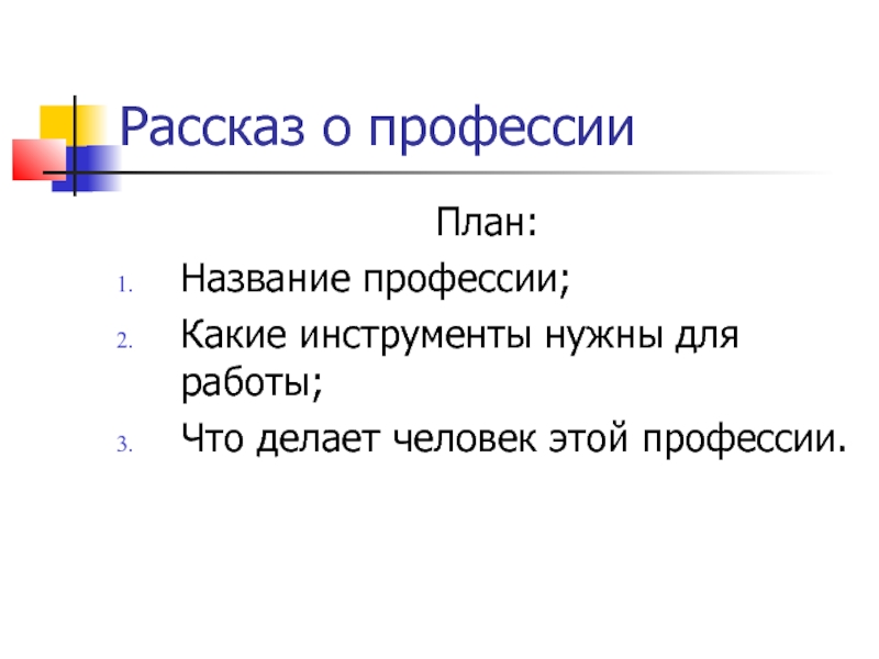 Рассказ о профессииПлан:Название профессии;Какие инструменты нужны для работы;Что делает человек этой профессии.