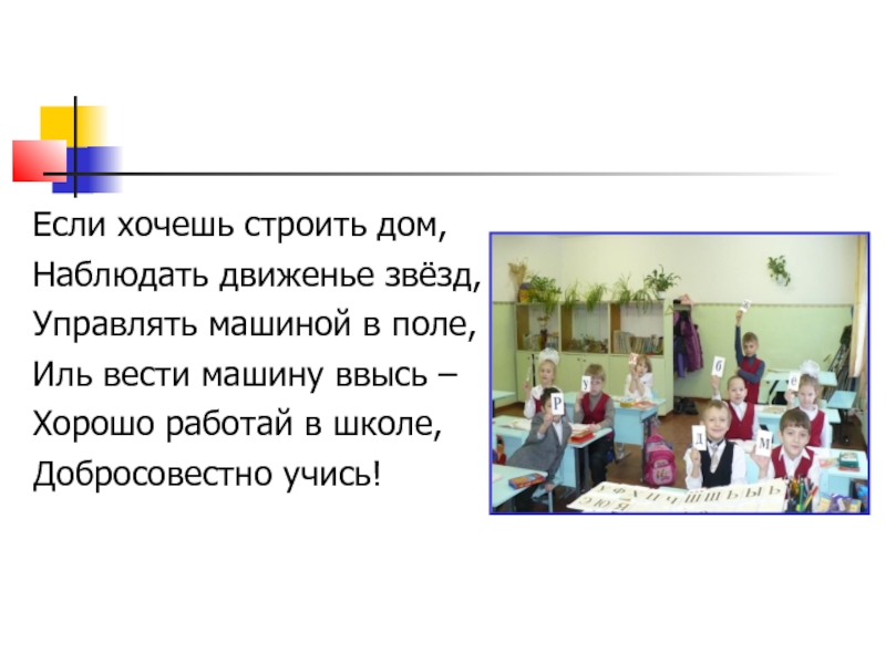 Если хочешь строить дом,Наблюдать движенье звёзд,Управлять машиной в поле,Иль вести машину ввысь – Хорошо работай в школе,