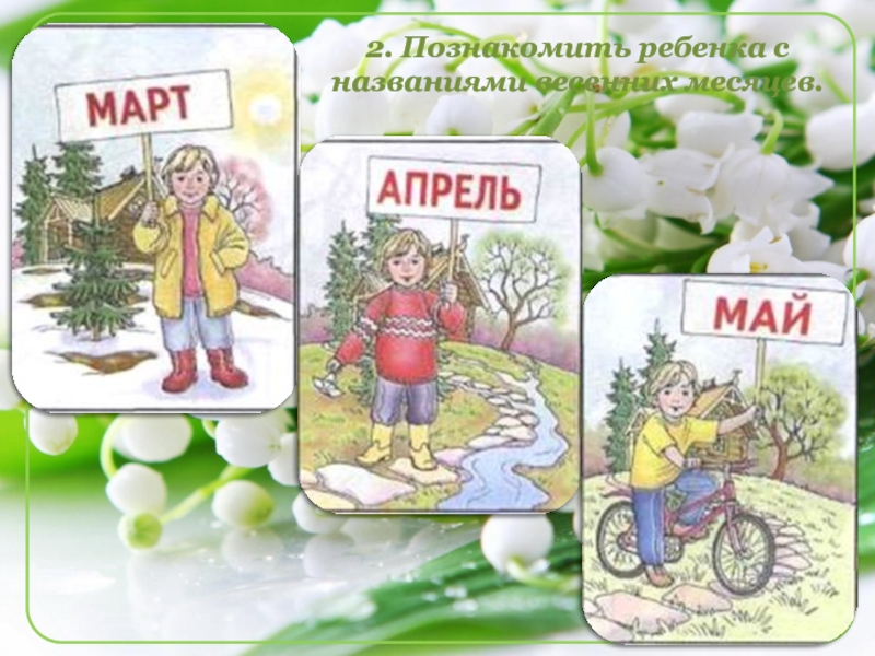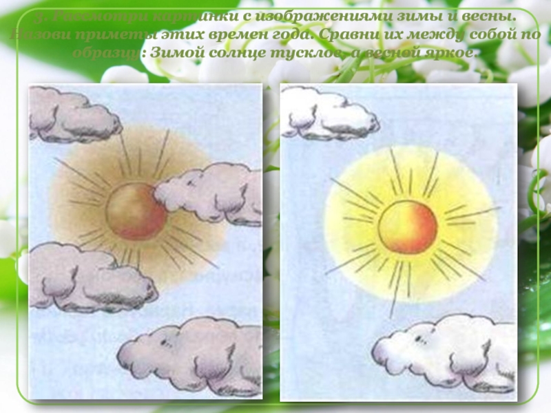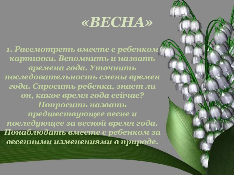 Уточнить последовательность смены времен года. Спросить ребенка, знает ли он, какое время года сейчас? Попросить назвать предшествующее весне и последующее за весной время года. Понаблюдать вместе с ребенком за весенними изменениями в природе.