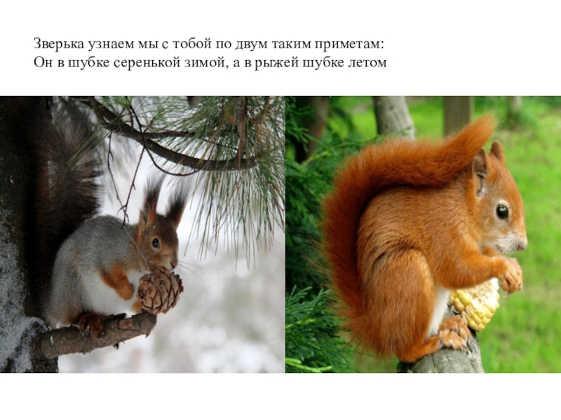 Зверька узнаем мы с тобой по двум таким приметам: Он в шубке серенькой зимой, а в рыжей шубке летом