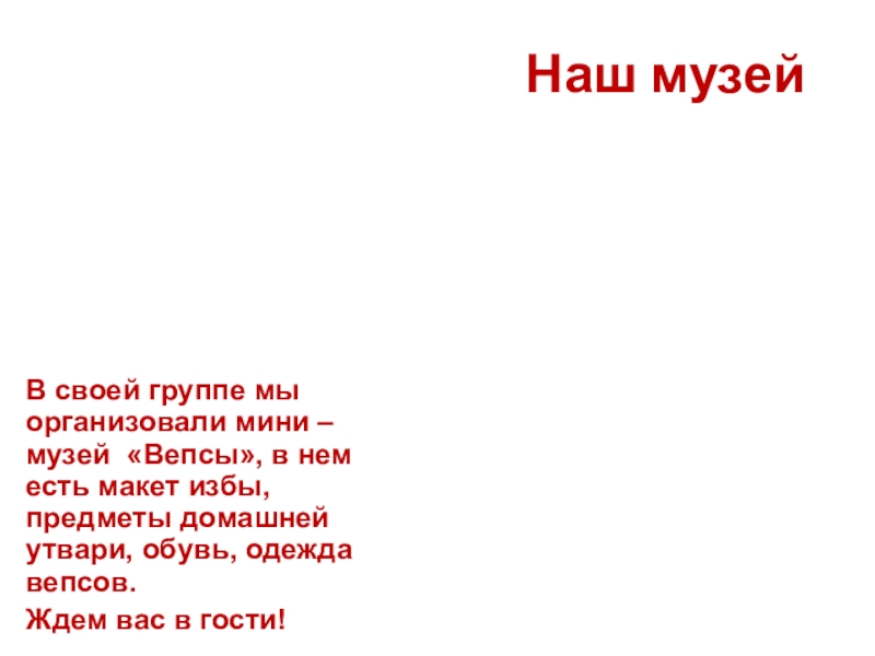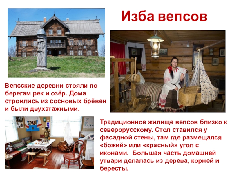 Традиционное жилище вепсов близко к северорусскому. Стол ставился у фасадной стены, там где размещался «божий» или «красный» угол с иконами. Большая часть домашней утвари делалась из дерева, корней и бересты.