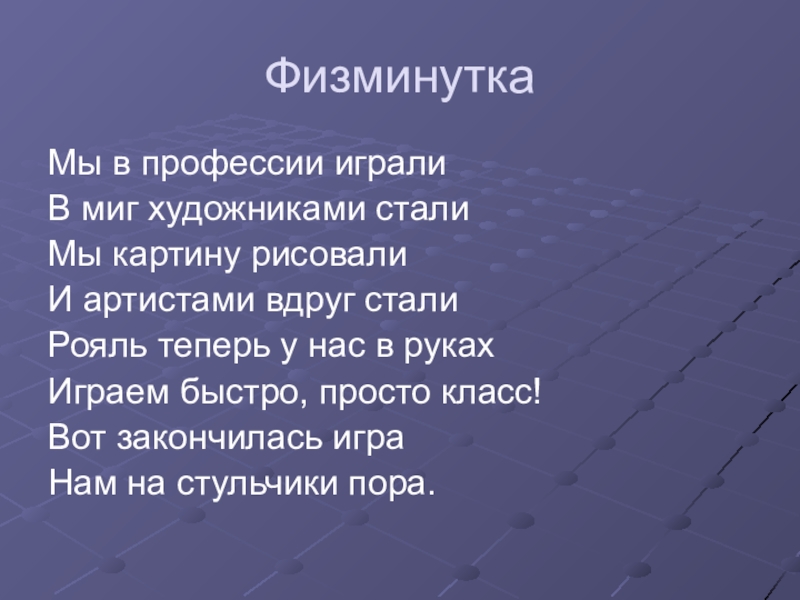 Физминутка Мы в профессии игралиВ миг художниками сталиМы картину рисовалиИ артистами вдруг сталиРояль теперь у нас в