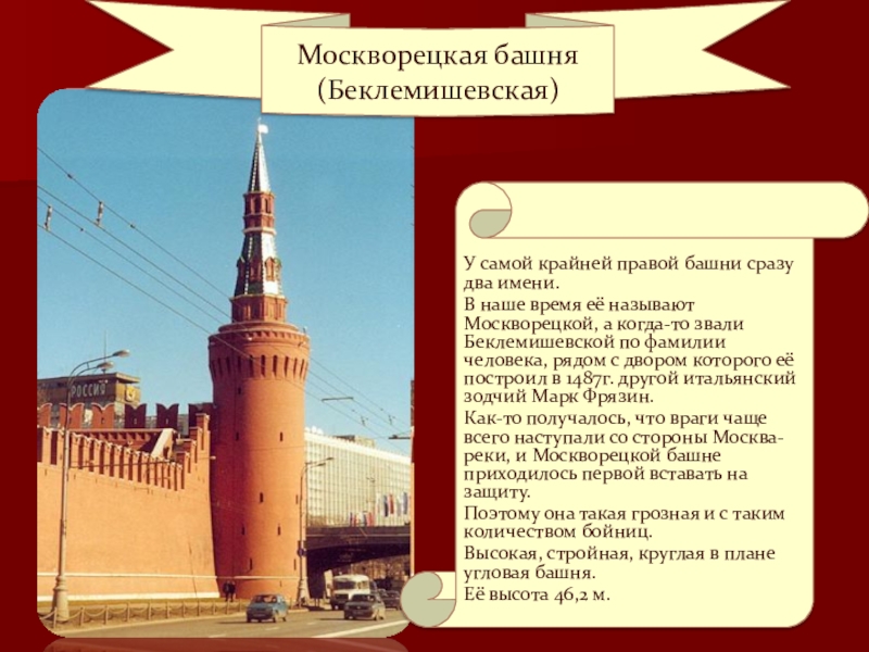 наше время её называют Москворецкой, а когда-то звали Беклемишевской по фамилии человека, рядом с двором которого её построил в 1487г. другой итальянский зодчий Марк Фрязин.