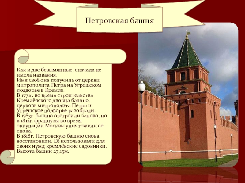 В 1818г. Петровскую башню снова восстановили. Её использовали для своих нужд кремлёвские садовники.