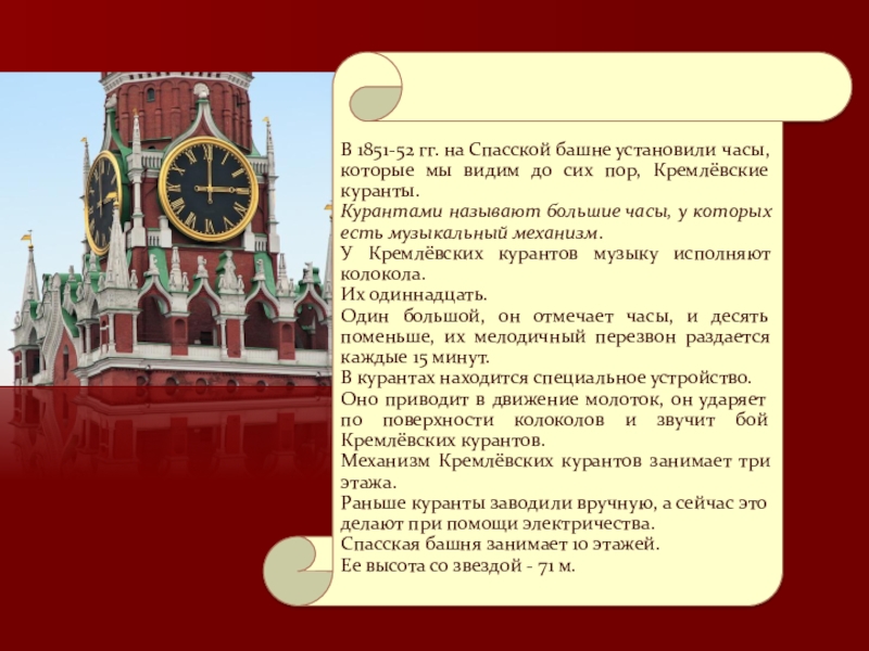В 1851-52 гг. на Спасской башне установили часы, которые мы видим