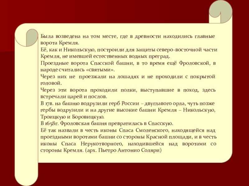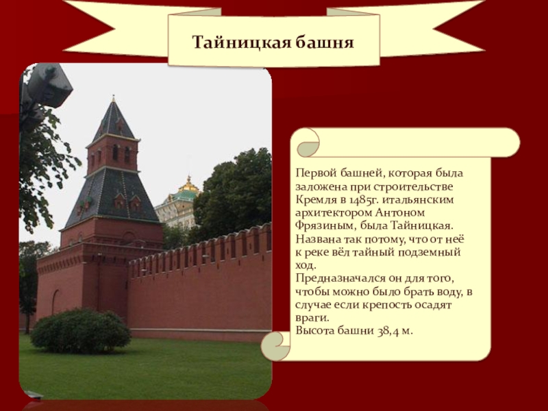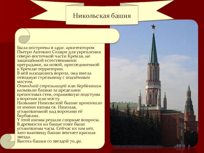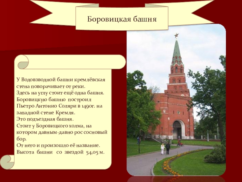 Боровицкую башню построил Пьетро Антонио Соляри в 1490г. на западной стене Кремля.