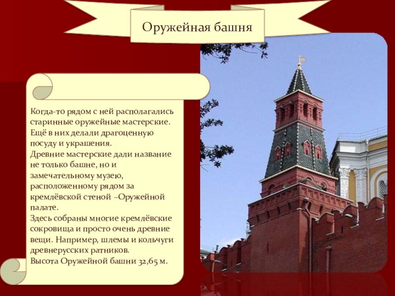 Древние мастерские дали название не только башне, но и замечательному музею, расположенному рядом за кремлёвской стеной –Оружейной палате.