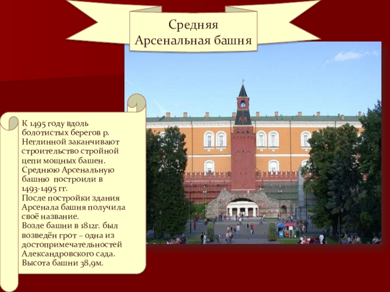 Возле башни в 1812г. был возведён грот – одна из достопримечательностей Александровского сада. Высота башни 38,9м.