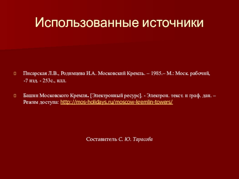 Писарская Л.В., Родимцева И.А. Московский Кремль. – 1985.– М.: Моск.